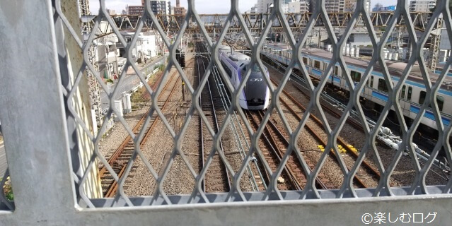 北側は中央線が真下にあります。速度を落とさずに通過していく中央線の中央特快や、特急「かいじ」「あずさ」の迫力がすごい!