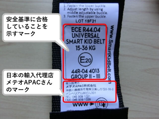 写真のように、スマートキッズベルトに付いているタグには安全基準と日本の輸入代理店としてメテオAPACさんの名前があります。
